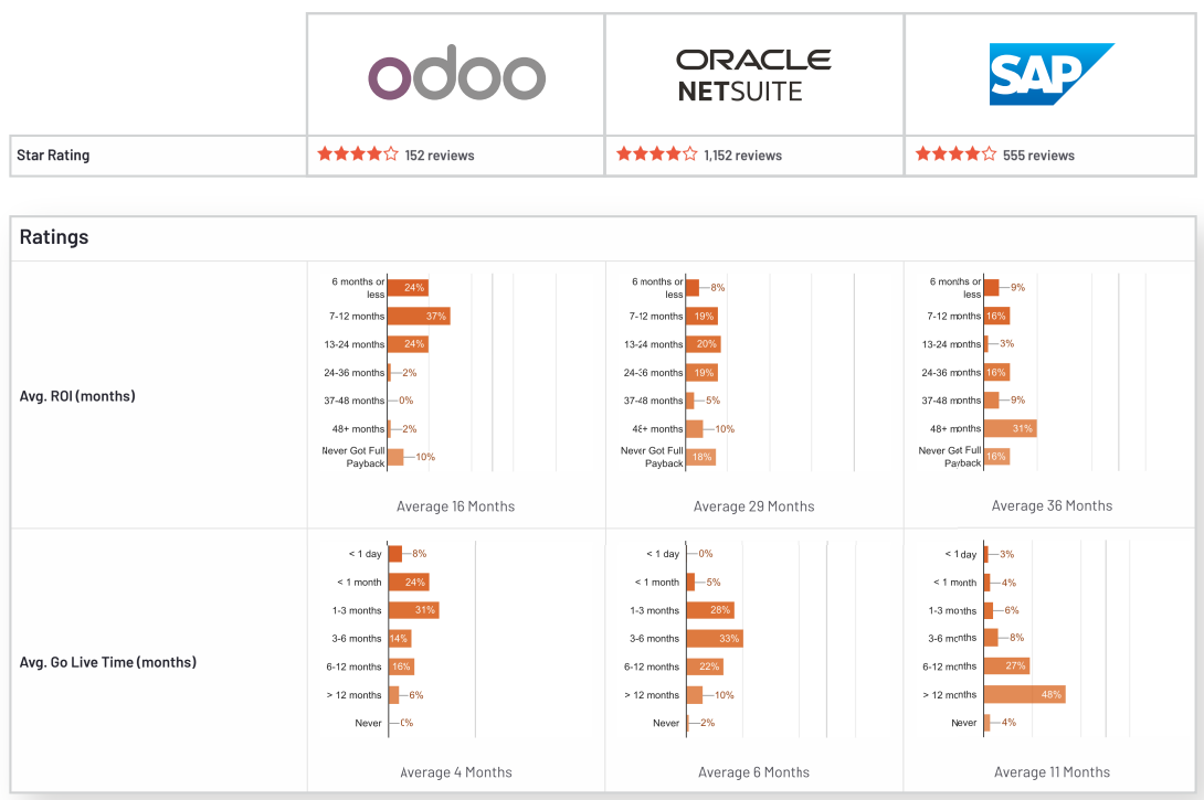 En un primer lugar nos centraremos en la media de tiempo tanto del retorno de la inversión como de la puesta en marcha, y es que si lo comparamos con Netsuit y SAP, Odoo les aventaja en una media de 13 y 20 meses respectivamente en el ROI y en una media de 2 y 7 meses en cuanto al tiempo medio de puesta en marcha. Es decir, Odoo permite tanto implementar el software como recuperar la inversión antes que los principales competidores. si nos fijamos en otros puntos, atendiendo a un informe realizado por G2 Crowd en el que se realiza una gráfica comparativa de softwares teniendo en cuenta los algoritmos Momentum y Satisfaction , Odoo se posiciona por delante de casi todos sus competidores, entrando así en el grupo de Momentum Leaders.